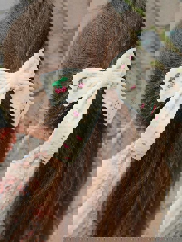 This Konges Sløjd hair clip comes in a light beige velvet finish with a bow shape. The surface is detailed with embroidered cherries and small hearts, finished with bead embellishment. A decorative accessory with a soft-look texture and a statement size.