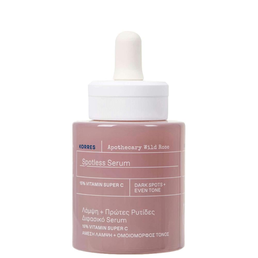 Korres Apothecary Wild Rose Spotless Serum is a bi-phase serum formulated to target dark spots, dullness and uneven skin tone. The formula combines 15% Vitamin Super C, stated to be 1000% better absorbed than pure vitamin C, with a blend of oils and actives for a concentrated, brightening-focused routine step across face and neck.