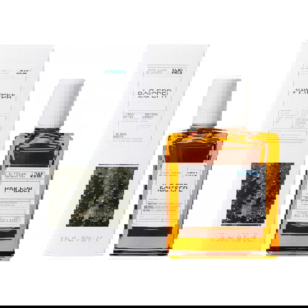 Korres Black Pepper Eau De Toilette is a multi-layered fragrance with woody, citrus, and amber notes.