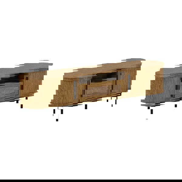 The LV55 Range boasts a classic yet luxurious design. The collection is characterised by its oval shapes and is adorned with artificial rattan. Designed for space efficiency, these furniture pieces with their rounded corners create a visual illusion of occupying minimal space in your living room. Finished in a traditional light oak, vintage but also modern. The LV55 TV Unit has curved doors that slide effortlessly around the end of the unit.