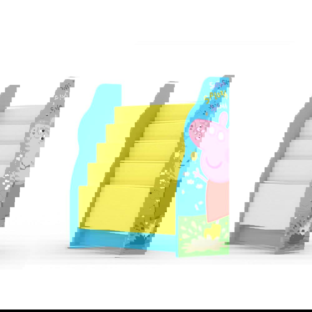 This Peppa Pig themed sling bookcase is ideal to showcase all your kid's favourite books, keeping them tidy and easily accessable. Featuring high quality digitally printed sides panels that show Peppa making a splash in the mud. This product provides plenty of room for a number of books, 4 sleeves in a light and bright yellow fabric.