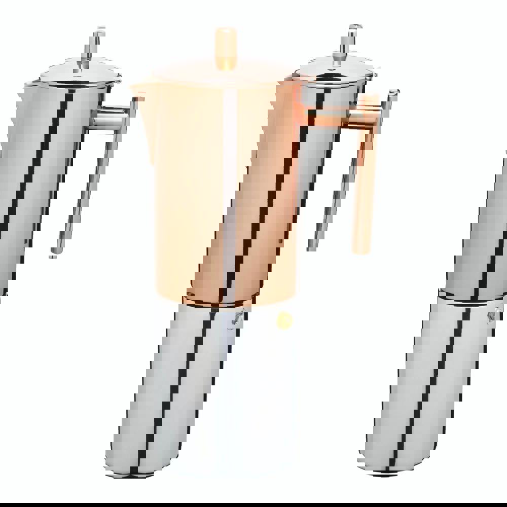 If you believe coffee should look good as well as taste fantastic, this copper stovetop espresso maker is for you. Display it proudly on a kitchen shelf, wheel it out as the star of your after-dinner coffee course, or simply treat yourself to daily espresso with a side of warm, elegant style. The combination of shiny stainless steel with the glowing copper finish is truly a sight to behold. But it's not all about good looks. This espresso pot makes rich, dark espresso in a matter of minutes. Simply add hot water to its lower chamber, fill its filter with coffee grounds, then heat on the stove. Voila! Espresso made simple. Made of high-quality, rust-resistant stainless steel and fitted with a leak-proof silicone gasket, it's built to last for years. Keep it as your trusty coffee companion, or gift it to an espresso fan. It comes securely packaged in a handsome, easy-to-wrap La Cafetière gift box. This large stovetop espresso maker has a ten-cup (600ml) capacity, so it's ideal for sharing. It's compatible with all stovetops including induction (a hob reducer ring is recommended if using it as a gas stove coffee maker). Disassembles for cleaning. Filter and bottom chamber are dishwasher safe. Includes a 10-Year guarantee