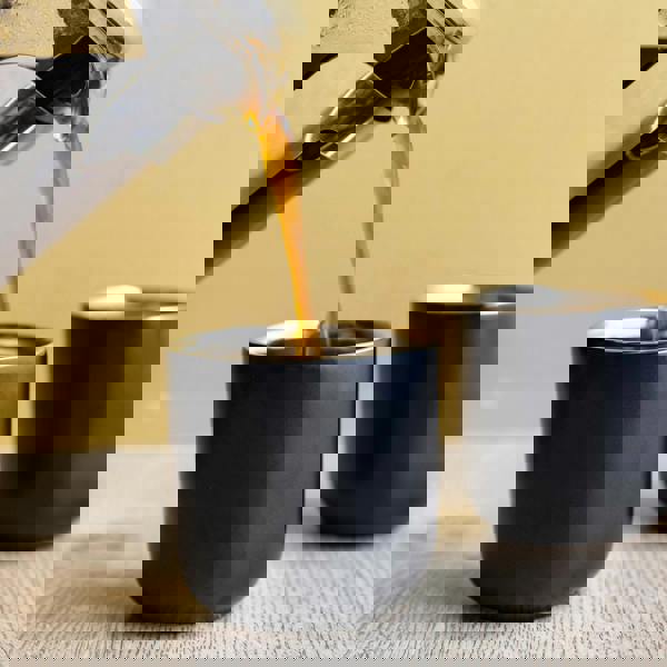 Coffee doesn't get much more luxurious than this. These beautiful double-wall espresso cups bring together a feast of textures and finishes, transforming daily drinks into truly special experiences. The outsides are smooth matte black, while the interiors have a gold finish that glimmers under the light. And with their sleek, modern silhouette – no handles! – they're made to be touched, hugged and enjoyed. Their double-walled design helps keep coffee warm while keeping the outsides at a comfortable temperature, so you can make those relaxing coffee breaks last a little longer. These black and gold mugs have a 70ml (2. 5 fl oz) capacity, making them ideal for double shots of zingy espresso. They come packed in a La Cafetière Edited gift box. This ensures they'll reach you in one piece, and makes them perfect for gifting if you fancy treating a coffee lover. This black and gold mug set includes two espresso insulated cups, each made of high-quality ceramic for long-lasting enjoyment. Covered by a 12-month guarantee.