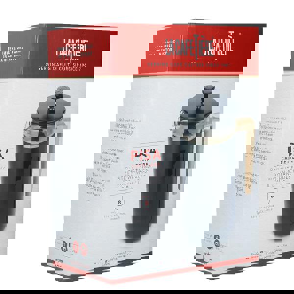 Who says your coffee routine has to feel "routine"? Inspired by one of Italy's most culturally rich cities, the Pisa cafetière is your ticket to a new adventure in flavour. This handsome black coffee maker features a sleek metal frame, a perfectly clear jug, and a smooth, natural beech wood handle. It's an eye-catching blend of the traditional and the contemporary – just like the city that inspired it. Of course, it makes great coffee too. Simply fill the glass cafetière jug with your favourite coffee grounds, let them steep in hot water, then plunge. Its fine-mesh stainless steel filter effectively traps grounds for smooth results every time. Now just sit back, relax, and enjoy the full, throaty flavours of proper cafetière coffee. The Pisa stainless steel coffee press is designed to withstand years of use and love. Its rust-resistant stainless steel frame encloses a robust, heat-resistant borosilicate glass jug. As well as looking great, the natural wooden handle helps keep your hands safe from the hot coffee. Securely packed in a gift box, this large cafetière makes a fine gift for a coffee lover. Or start your own collection, with three-cup and eight-cup versions available in a range of stylish colours. Beaker is dishwasher safe. Pieces disassemble for easy cleaning. Covered by a 10-year guarantee.