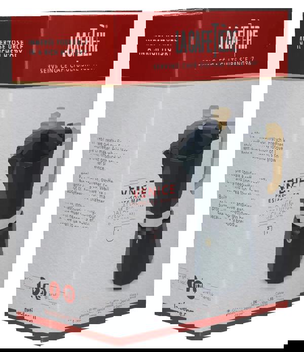 If you value eye-catching style and great-tasting espresso, you'll love this metal stovetop coffee maker from La Cafetière. Made of high-quality aluminium, it pairs a traditional shape with a dark black finish and natural wood handle. Keep it perched on your stovetop, and it will serve up delicious, piping-hot espresso every morning while giving your kitchen a touch of contemporary class. Can't wait for that next cup? Its aluminium construction means it takes on heat fast, so it will be hot and bubbling in no time. This also allows for better flavour extraction, so you can expect every cup to be rich and zingy. You can use this aluminium espresso maker on all stovetops, except induction. Gas, electric, AGA™️. . . it's all good. The wood effect handle and knob stay cool to touch, so it's easy to retrieve from the stove and feels great to pour. This aluminium coffee percolator has a 290ml (10 fl oz) capacity, which amounts to six double espresso cups. It comes in an attractive La Cafetière gift box, so would make a great gift for a style-savvy coffee lover. Other colours and sizes available. Disassembles for easy cleaning. Covered by a 10-year guarantee. AGA™️ is a registered trademark of Aga Rangemaster Group Limited.
