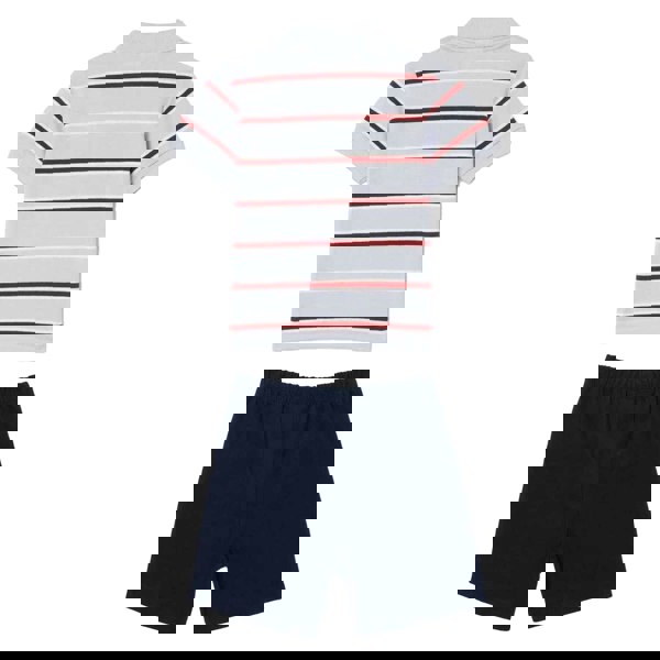 100% Organic Cotton. Fabric: Mini Pique. Design: Logo, Striped. Pockets: 2 Side Pockets. Waistline: Elasticated. Sleeve-Type: Short-Sleeved. Neckline: Turn Down Collar. 2 Button Placket. Fastening: Pull-On. Contents: 1 Shorts, 1 T-Shirt. Sustainability: GMO Free. Packaging: Pouch.