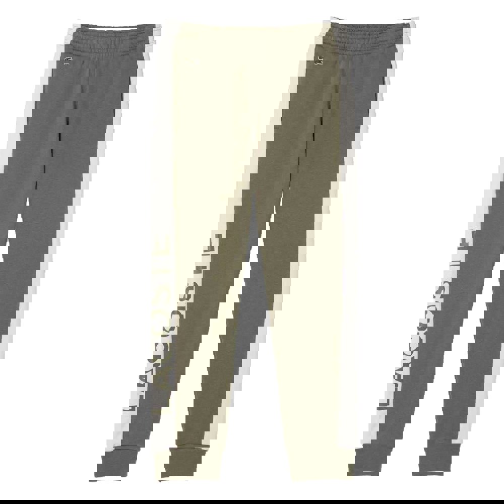 These Lacoste childrens/kids jogging bottoms are made from a fleece fabric with organic cotton and recycled polyester. The green finish is paired with contrast detail and a printed text design, completed with an embroidered logo.