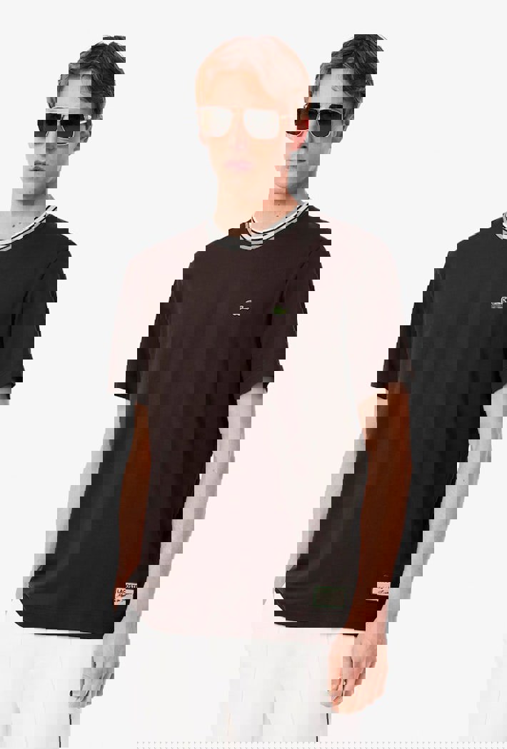 This T-shirt is the fruit of 90 years of Lacoste elegance and knitwear expertise. Made in France from comfortable cotton jersey with a contrasting striped neckline, with knit detailing for added texture. A sophisticated piece, finished with a logo badge and embroidered signature crocodile.