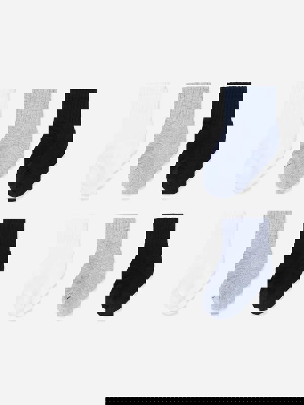This Lacoste Kids sock set includes six pairs in navy. Each pair carries the Lacoste crocodile emblem for a recognisable branded finish. The set suits a range of children’s wardrobes, with a consistent colour across all pairs.