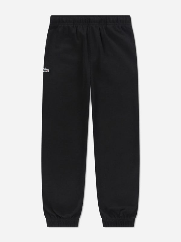 Lacoste Kids contrast seam track pants in black bring a clean, modern look to everyday outfits. The classic black colourway is finished with contrast seam detailing for a sharper outline and a more defined silhouette.