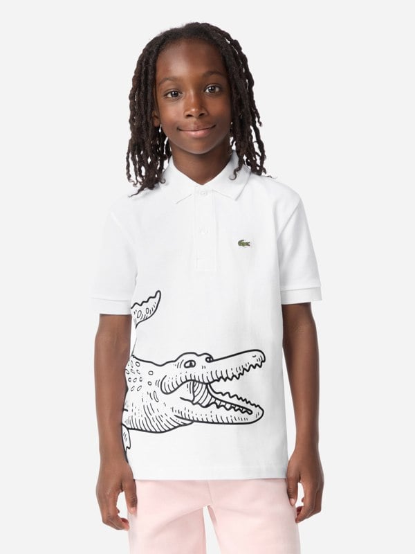 Lacoste Kids boys petit piqué icon polo shirt in white for AW2025. This classic polo style keeps the look clean and simple, finished with the iconic Lacoste crocodile logo. Made from cotton, it offers a lightweight feel for everyday wear.