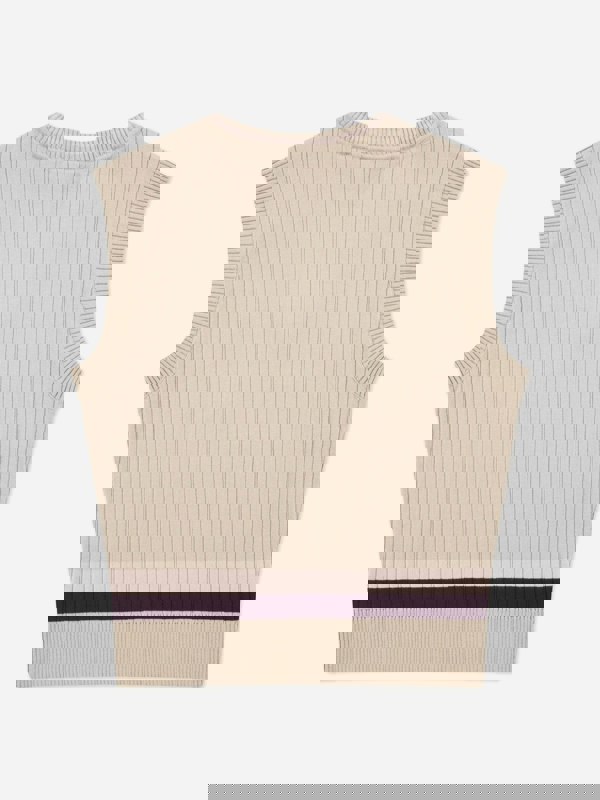 This Lacoste Kids sweater vest comes in beige with a brushed rib finish. The sleeveless design suits layering as part of an autumn/winter wardrobe for 2025, keeping the look clean and simple while adding texture through the ribbed construction.