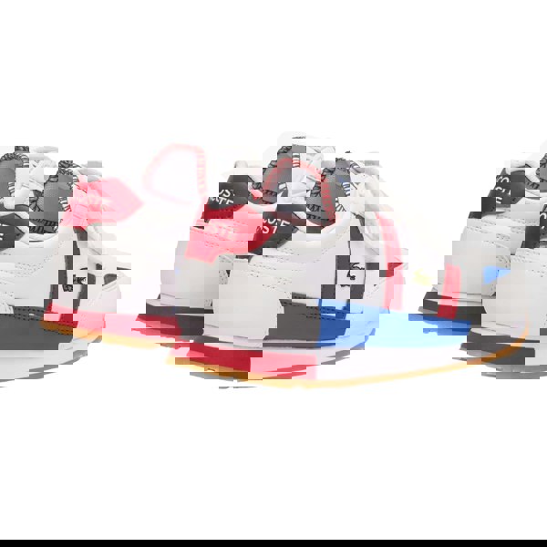 Lacoste Kids Partner Trainers in white and red with a low-cut profile and flat sole. The upper is made from nylon, finished with contrast detailing and logo branding. A round toe shape keeps the silhouette classic, while the dual touch fastening provides a secure closure.