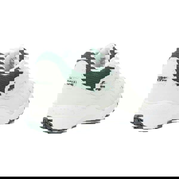 Lacoste Aceline trainers in off white with a low-cut profile and flat sole. The upper combines leather with recycled polyester, finished with a two-tone design and logo detailing. A mesh collar and mesh tongue add texture to the silhouette, while the round toe keeps the shape classic.