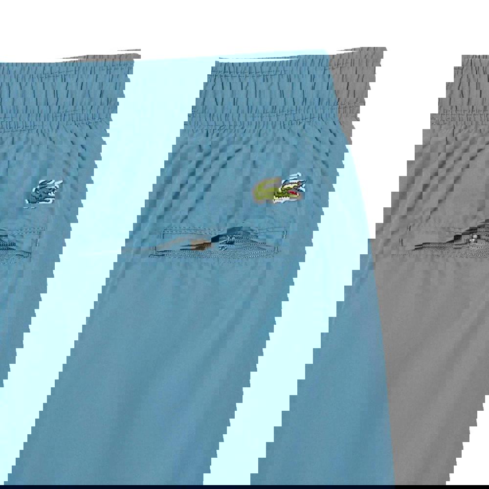 Lacoste long length swimming trunks in blue. Made from 100% polyester with a canvas fabric and mesh lining. The design includes a logo. A drawstring and elasticated waist provide the fastening. Fabric technology is breathable and quick dry. Made from recycled materials.