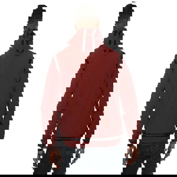 This Lacoste men’s hooded jacket is made from a woven fabric with 88% polyamide and 12% elastane. It comes in a wine colourway with lettering and logo detailing, finished with perforated sections for added design interest. A full zip fastening runs through the front for easy wear.