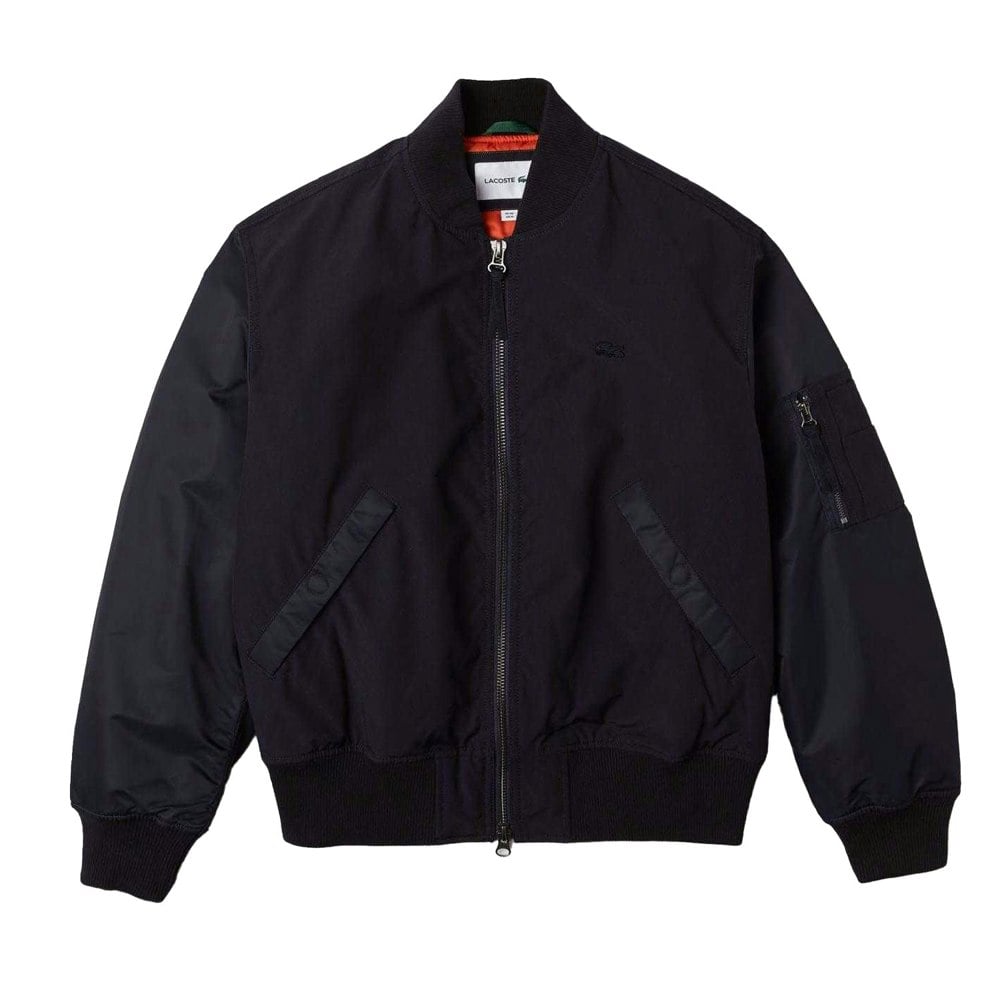Crafted from a blend of 84% polyester and 16% cotton, this Lacoste bomber jacket comes in navy with a plain finish and logo detailing. It is cut with long sleeves and a full zip fastening for straightforward layering.