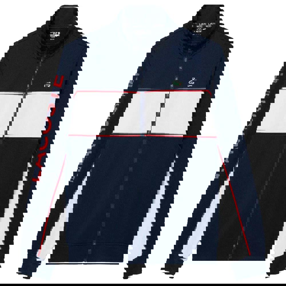 This Lacoste tennis jacket comes in navy blue and white with a contrast panel design and printed logo detailing. Made from 100% polyester in a technical fabric, it has an abrasion resistant finish and a classic fit for a clean, sporty profile.