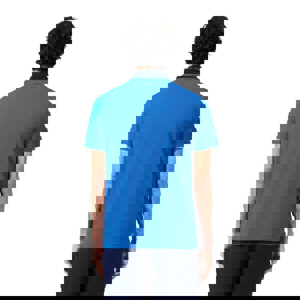 This Lacoste Novak Djokovic tennis polo shirt comes in blue with a knitted piqué construction. It uses 100% polyester and includes recycled materials. The design combines contrast detailing with graphic print, lines and a logo, finished with a collared neckline and short sleeves.