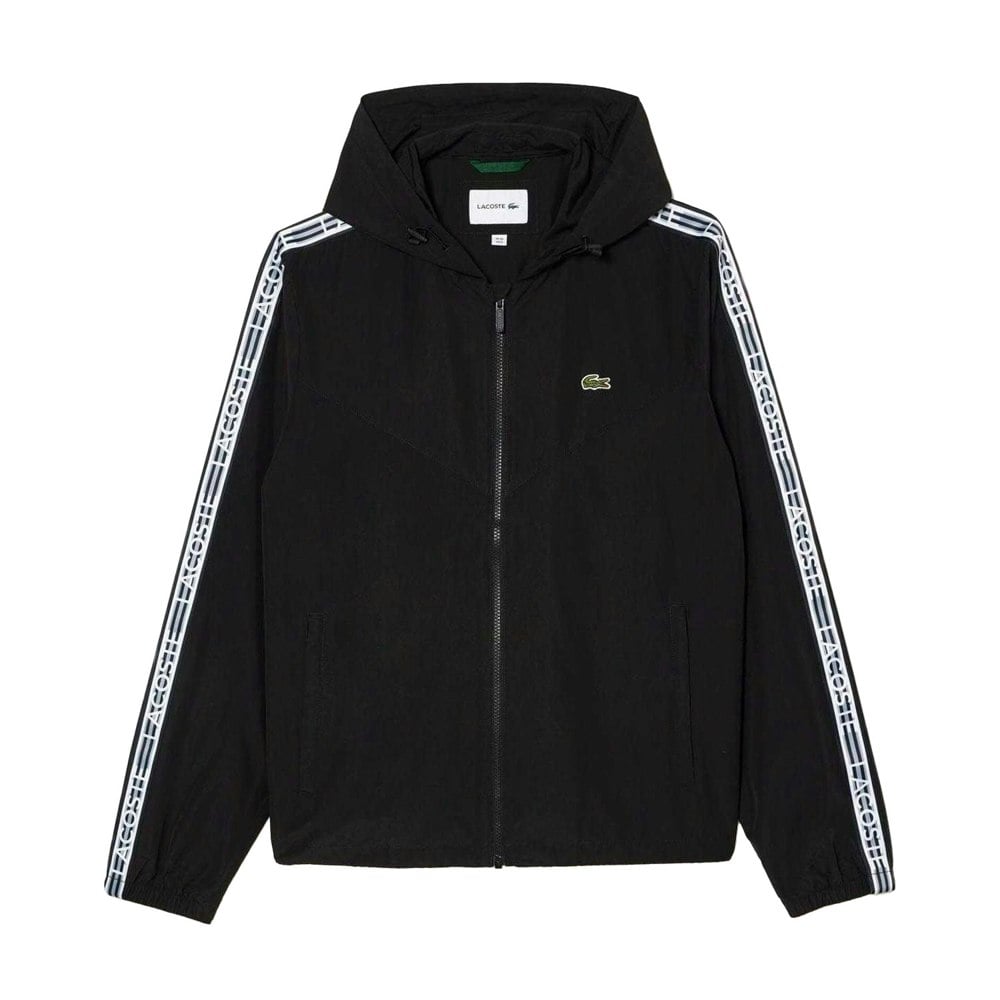 This Lacoste track jacket is made from recycled polyester and finished in black. The hooded neckline includes a drawstring, while long sleeves keep the silhouette classic and practical for everyday wear.