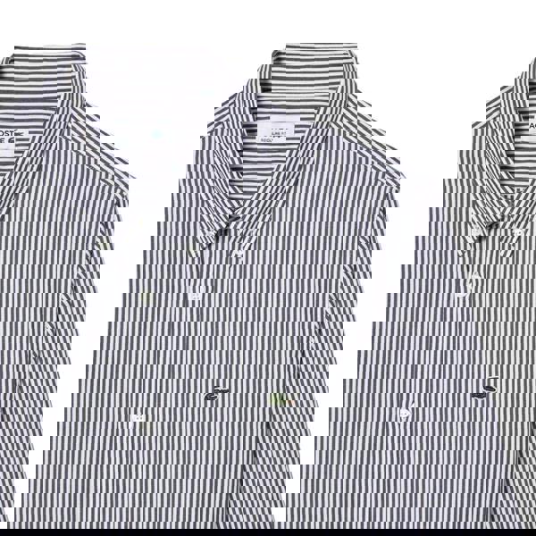 This Lacoste men’s shirt is made from 100% cotton in woven oxford cloth and poplin. The white and navy striped design is finished with an embroidered logo for a clean, classic look. A turn down collar and button-down fastening keep the front neat, while long sleeves with buttoned cuffs provide a structured finish.