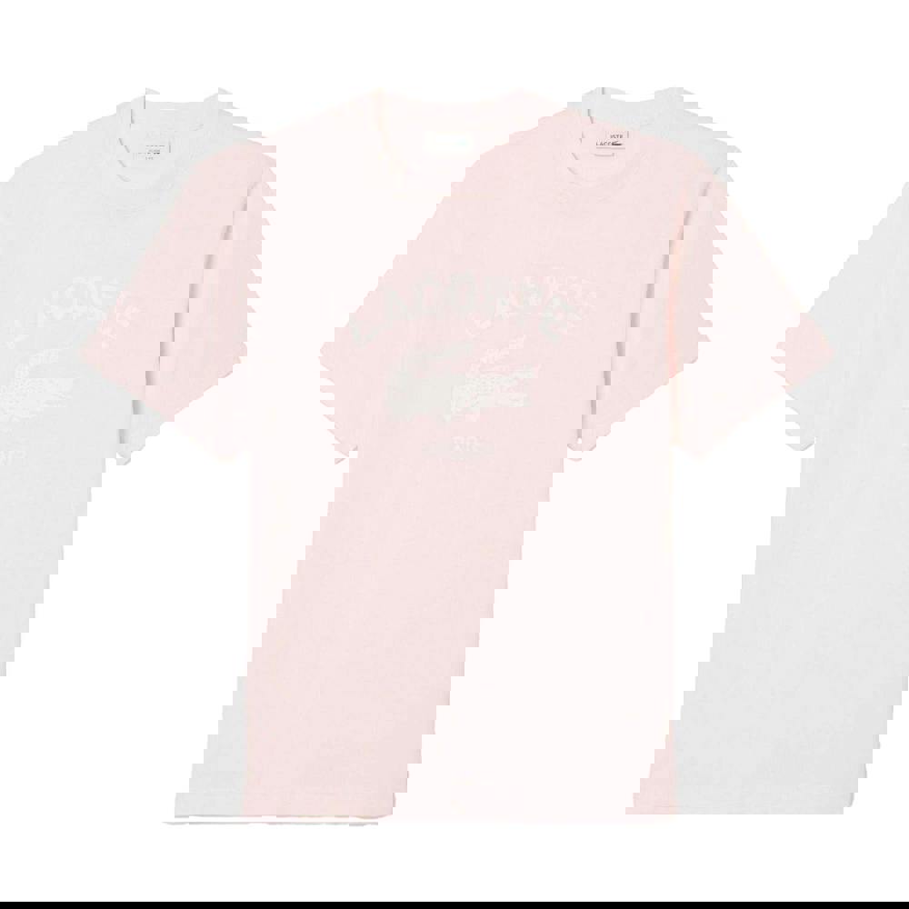 This Lacoste unisex adult T-shirt is made from 100% cotton and finished in pink. A signature print brings together logo, text and printed detailing for a clean, modern look. The crew neckline and short sleeves keep the design simple and easy to wear, while the drop shoulder adds a relaxed outline.