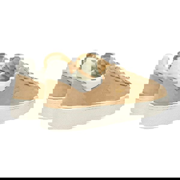 Lacoste Baseshot Premium Suede trainers in brown with a low-cut profile and flat sole. The upper combines leather with nylon and polyester, finished with embroidered detailing, gold foil accents and logo branding. A round toe and lace-up fastening keep the look classic and secure, while seven eyelets complete the clean, structured front.