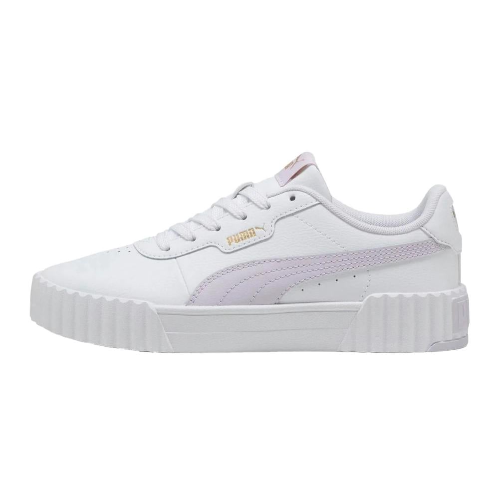 Lacoste Carina 3.0 trainers in white and purple with a low-cut profile and a two-tone finish. The upper is made from synthetic leather, paired with a SoftFoam insole for underfoot comfort. A chunky flat sole and round toe shape create a clean, everyday look, while the lace-up fastening secures the fit through six eyelets. Branded detailing on the tongue completes the design.