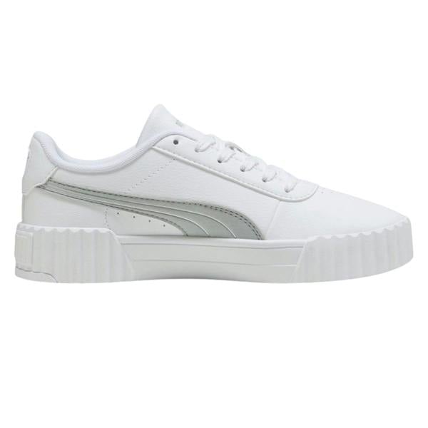 Lacoste Carina 3.0 trainers in white and silver with a low-cut profile and two-tone design. The upper is made from synthetic leather, finished with a branded tongue and a round toe. A lace-up fastening runs through six eyelets for a secure, adjustable fit.