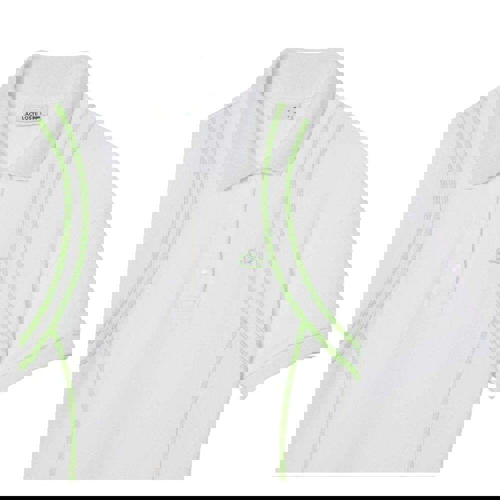 Finished in white, it is detailed with a contrast stripe and logo. A ribbed, turn-down collar and ribbed short sleeves complete the look for a clean, sporty profile.