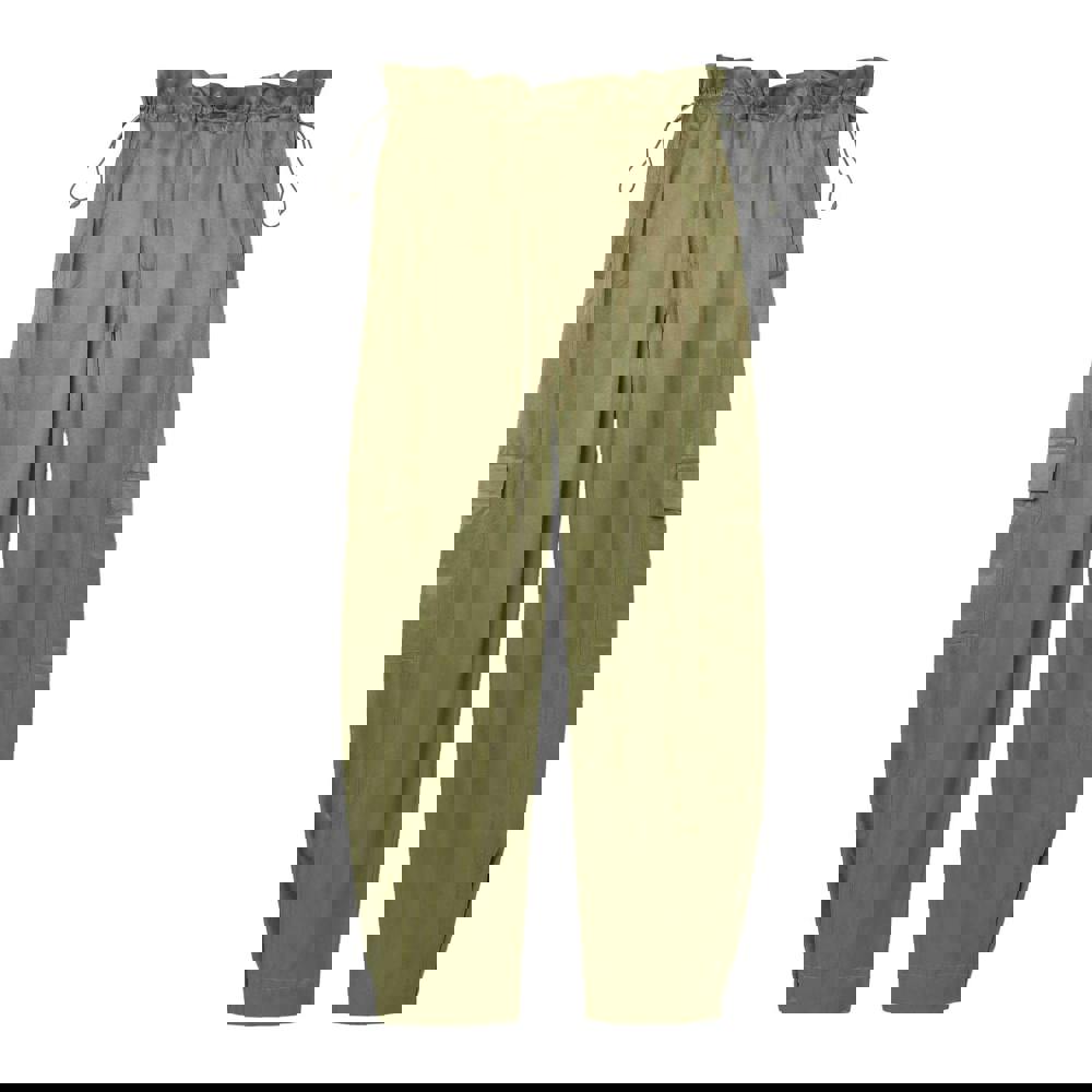 A drawstring waistband with partial elastication adjusts the shape at the waist. Practical storage comes from two side pockets and two cargo pockets. Split hems add a subtle detail at the ankle, making them easy to style with everyday separates.