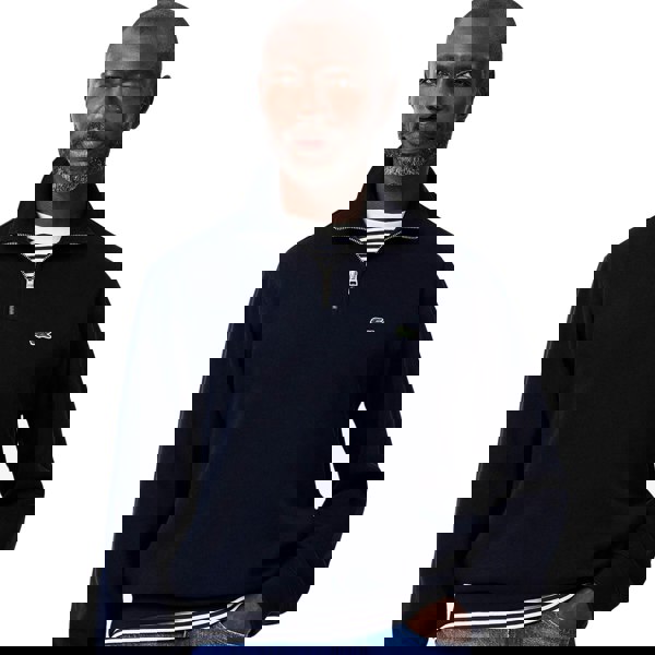 This Lacoste sweatshirt features a classic fit with a high zip-up neck and ribbed cotton interlock fabric. It includes a jacquard chevron pattern inside the collar and is finished with the iconic embroidered crocodile on the chest, combining style and comfort seamlessly.