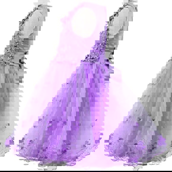 The elegant tulle dress embedded in 3D flowers, sequins, and also displaying a back satin sash that's also combined with a cotton lining, showcases exquisite craftsmanship and attention to detail.