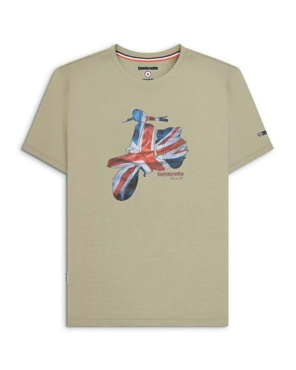A scooter print takes centre stage, showing a Lambretta scooter finished with the iconic Union Jack flag. Subtle detailing completes the design, with sleeve embroidery and a branded woven label set into the side seam.