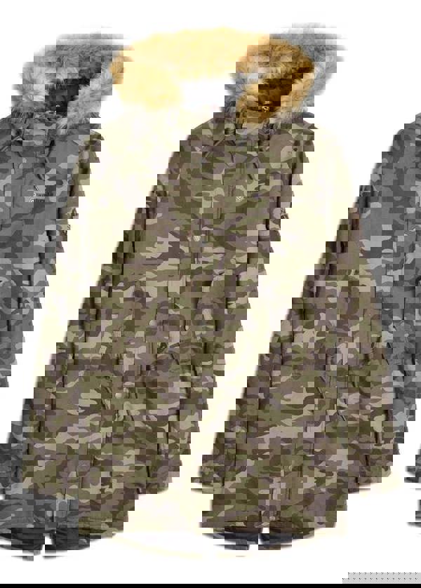 Stay warm and blend in with this Camouflage Parka. Featuring a padded body and faux fur detachable hood trim, this fishtail parka also has two pockets with snap fastening and a drawstring hood. The embroidered logo on the chest adds a touch of style while the drawcord waist and ribbed inner cuffs provide a snug fit.