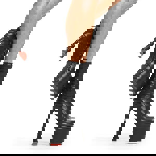Addicted Platform Ankle Boots in Black stretch faux leather. These platform boots feature on our platform sole in additon to a heart shaped heel with a red heart at the bottom. reach new heights in your fashion game. these platform boots are on point.
