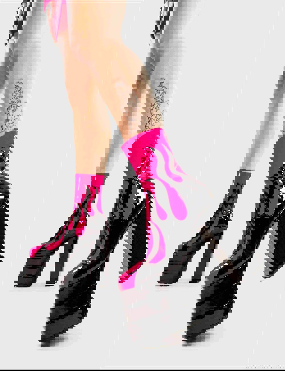 Reborn Platform Ankle Boots in Fuchsia faux leather. These platform boots feature a black flame design on our triple stack platform sole. these platform boots are Fire.
