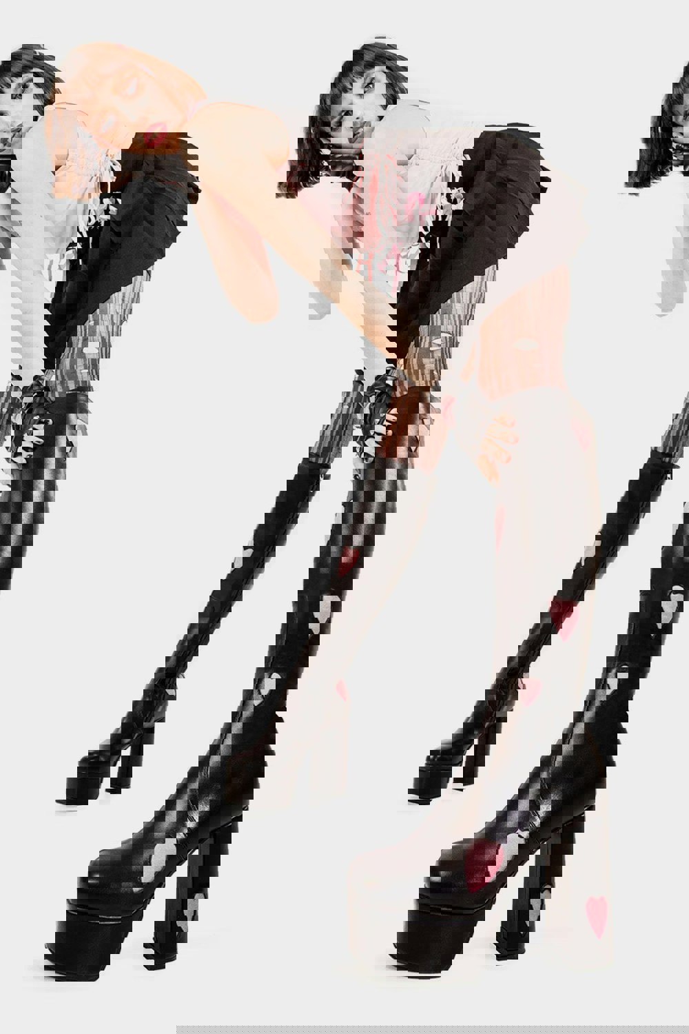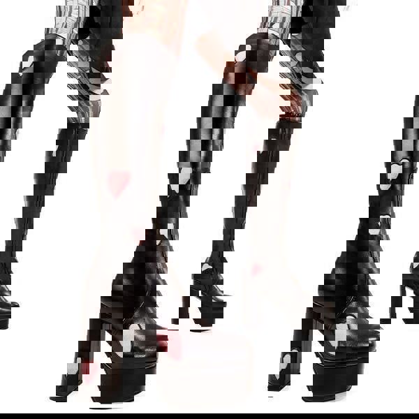 Add a playful touch to your outfit with these black knee-high boots featuring iconic pink faux suede hearts. With a platform sole and heel, they add height and style while being made from eco-friendly, 100% cruelty-free materials—cute and ethical!