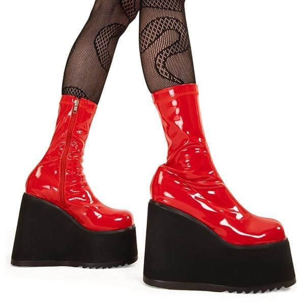 Lights Out Chunky Platform Ankle Boots in Red Patent faux leather. These red platform boots feature on our chunky platform wedge sole, step up your shoes game! these platform boots are Fashion Staples!