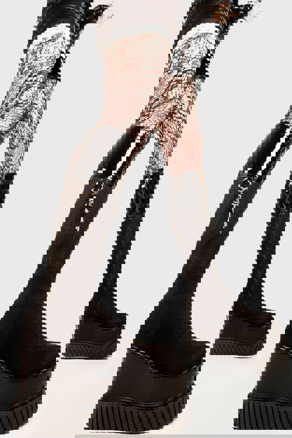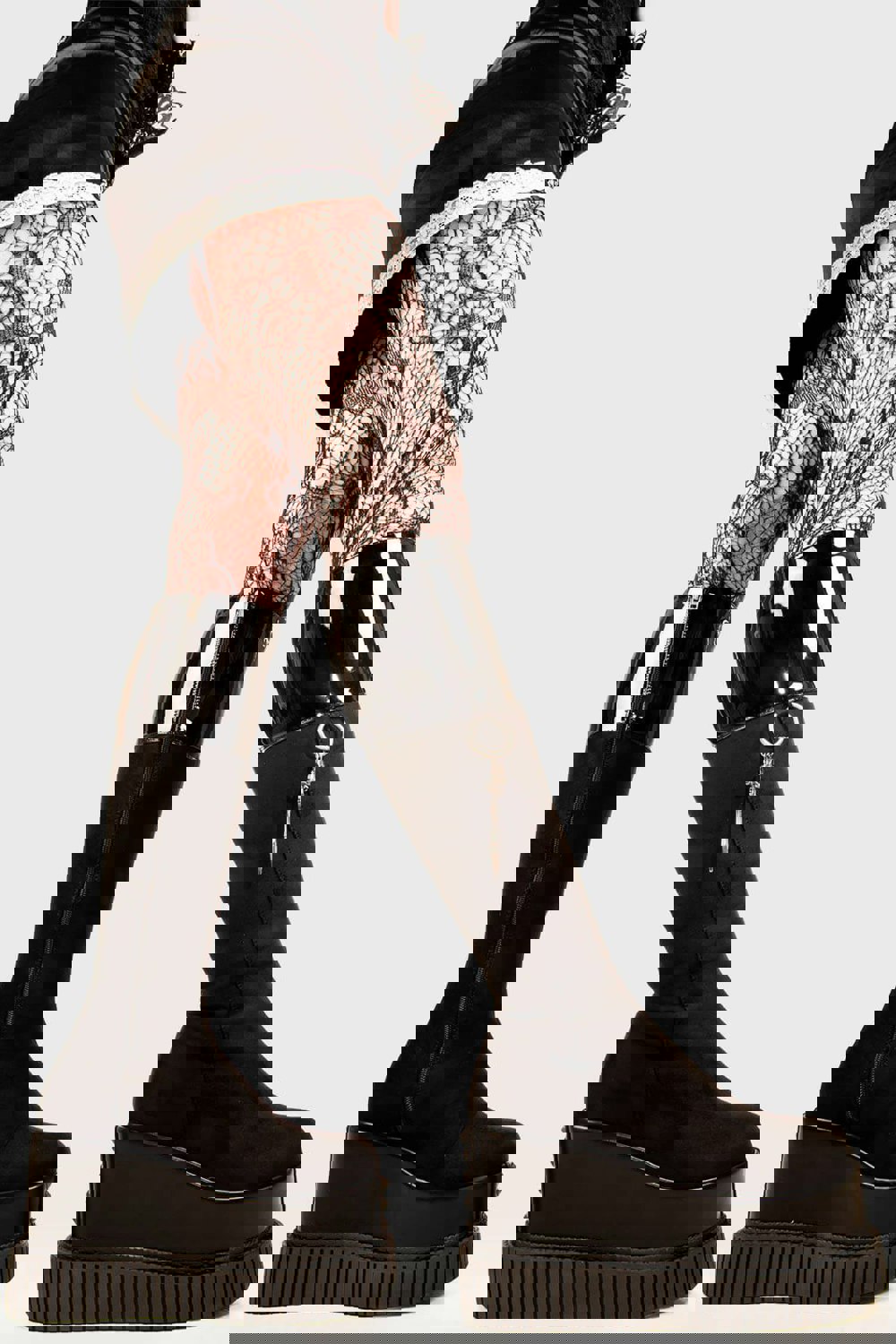 Turn heads with every step in the Devious Chunky Platform Boots. Made in sleek black faux leather, these knee-high boots feature bold dual silver zippers — one on the outer and one on the inner side — for that extra designer edge. With a towering 3-inch chunky platform sole and a classic round toe, these boots deliver fierce style with a fully vegan, eco-conscious build.