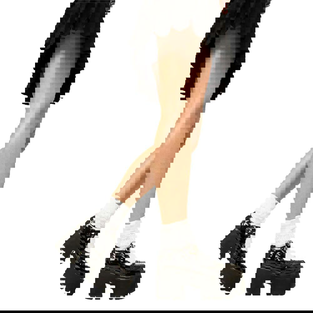 Elevate your style with the Lamoda Dedicated Chunky Mary Jane Shoes in Black Patent. Featuring a bold platform sole and classic Mary Jane buckle design, these shoes combine gothic charm with contemporary edge. Made from glossy BlackPAT material, they offer a sleek finish that's perfect for alternative fashion, Lolita styles, and streetwear. Whether you're heading to a concert, fashion event, or casual outing, these statement shoes are built to turn heads and keep you comfortable throughout the day.