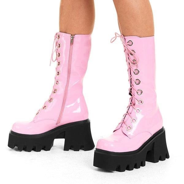 Get Paid Chunky Platform Calf Boots in Pink patent. These western Boots feature a pink lace up boot with silver round eyelets , very classy. and , these boots are as ethical as they are edgy!