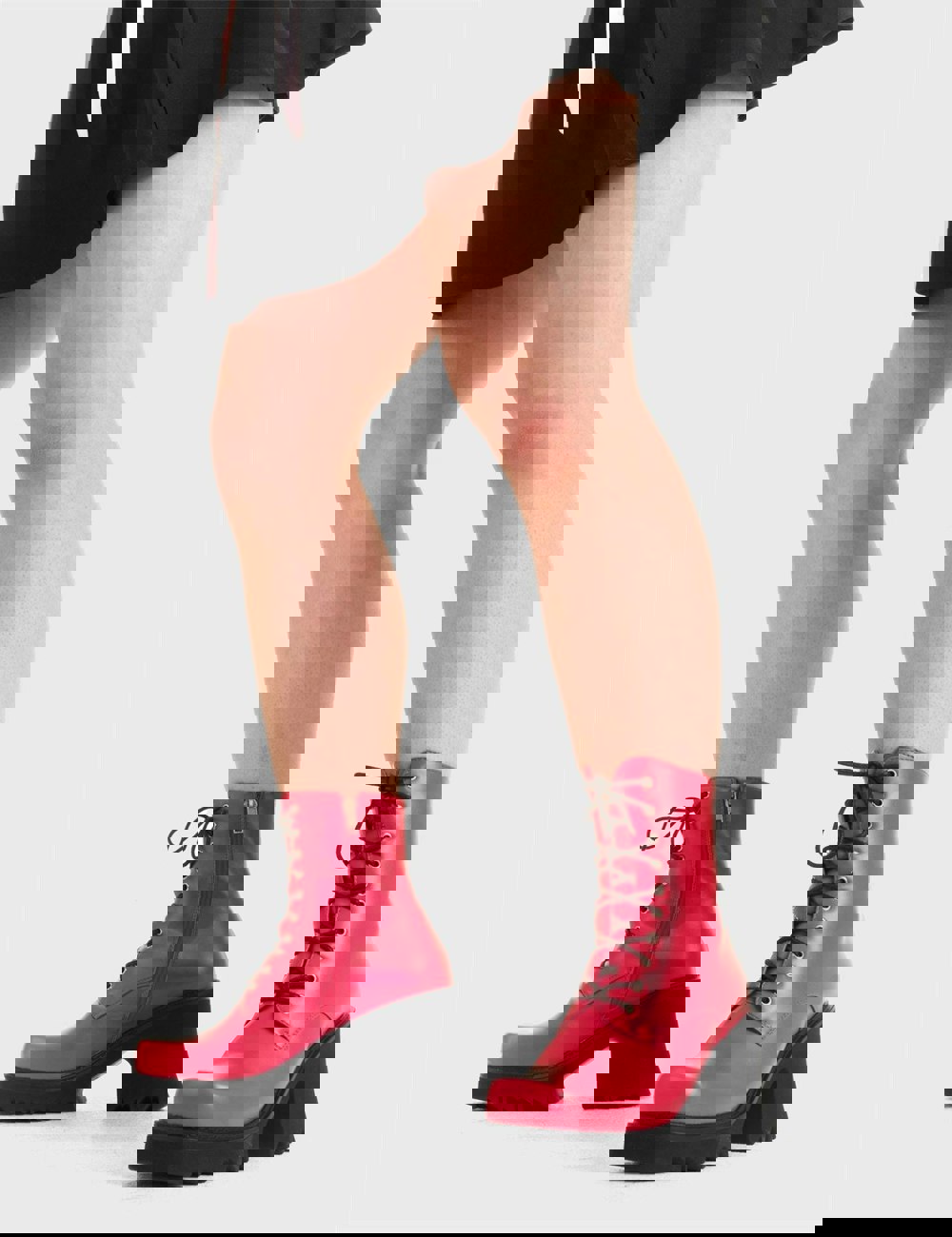 In Opposition Chunky Platform Ankle Boots in Fuchsia faux leather. These western Boots feature black laces and a shark teeth grip sole, very chic. these boots are edgy!