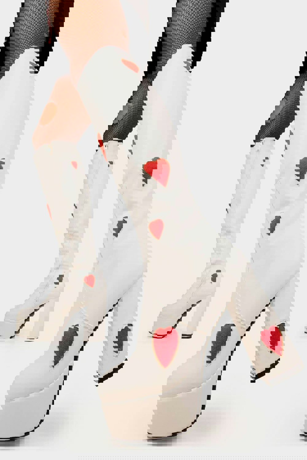 Straight from your feed to your feet — the Jam Tarts Platform Boots are Insta-famous for a reason. Featuring bold red faux suede hearts, a platform sole, and a sleek knee-high fit, these white vegan boots are the perfect blend of playful and iconic. 100% cruelty-free and made with eco-friendly materials.