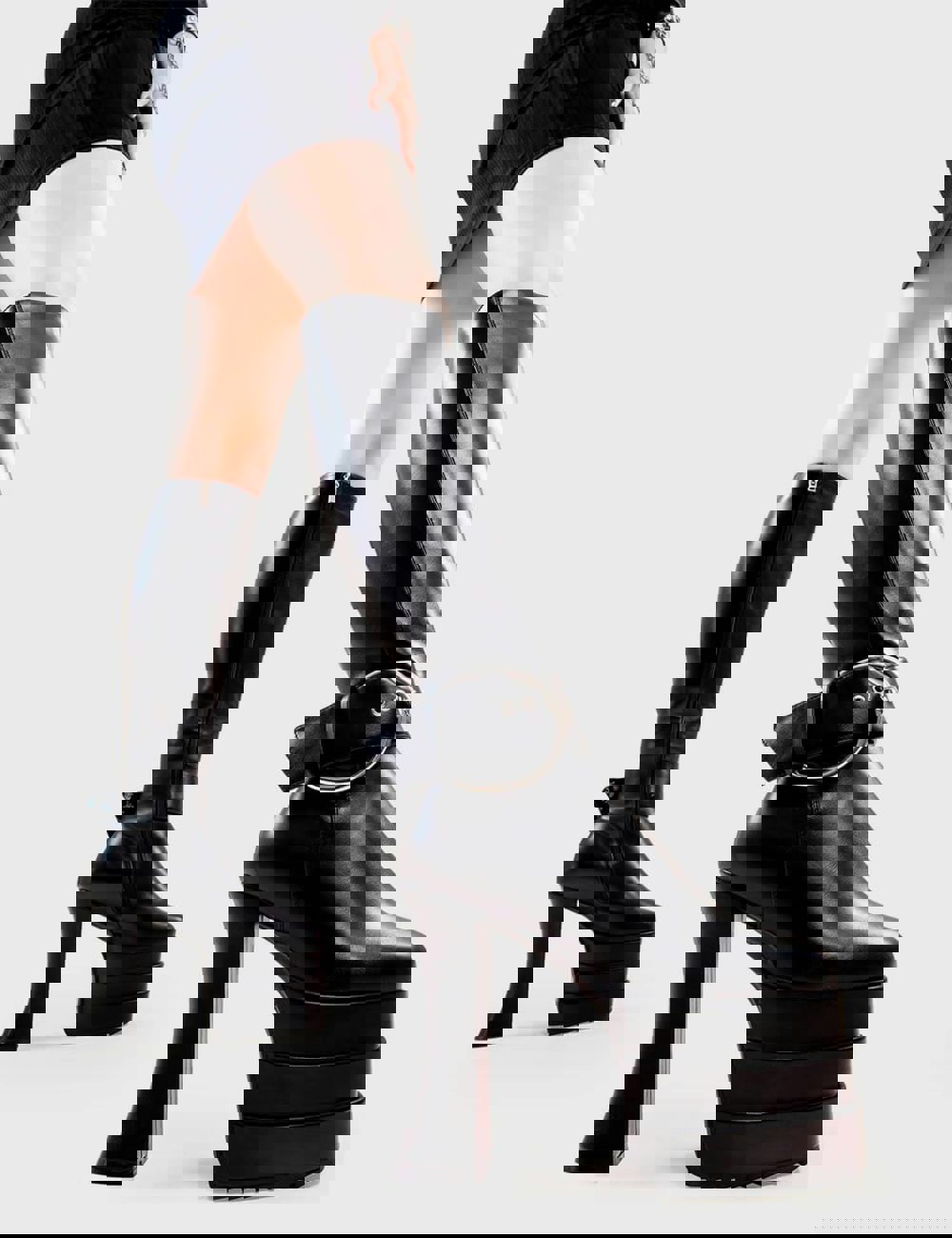 Step boldly into the spotlight with the Short Term Loss Platform Knee High Boots in sleek black faux leather. Designed to dominate the street-style scene, these boots feature a statement ankle strap with silver eyelets and an oversized buckle, paired with our signature triple-stack platform sole and aggressive shark’s teeth grip for next-level attitude.