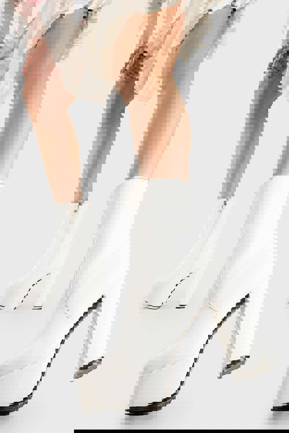 These eye catching boots feature a significant block heel and a robust platform sole that provides substantial height while ensuring a confident stride. The streamlined ankle high design and classic round toe offer a flattering fit that pairs effortlessly with everything from colourful mini dresses to baggy cargo trousers. With a secure side zip entry for easy wear, these white platforms deliver the perfect combination of all-day comfort and high-impact style for anyone looking to make their next fashion move.
