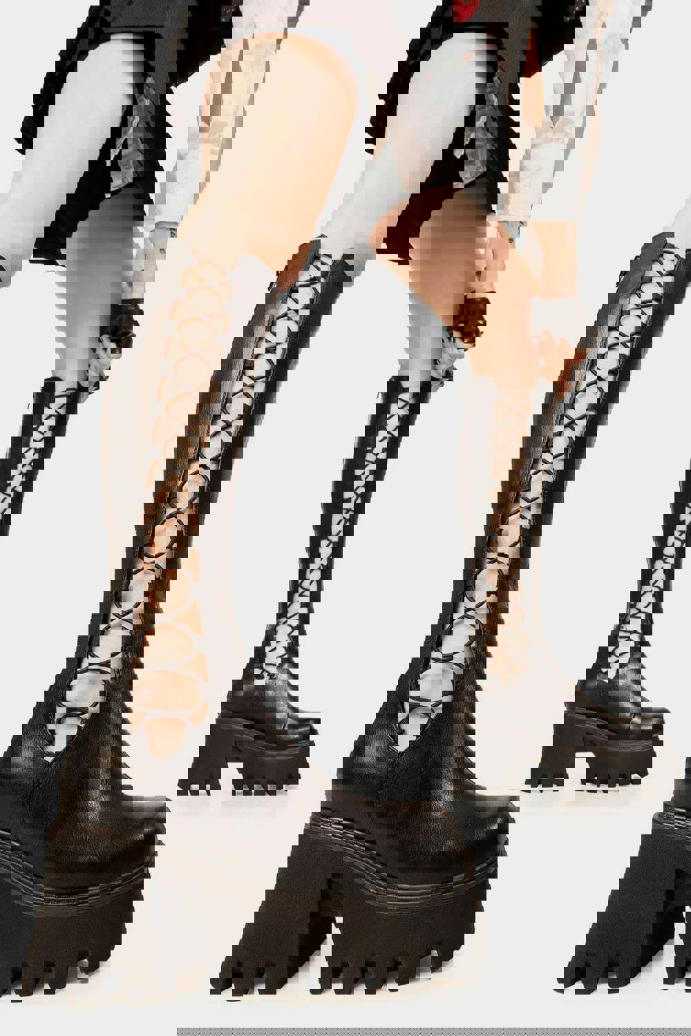 Channel your inner rockstar with these iconic Lamoda Misery Business platform knee high boots in a sleek black PU finish. Taking inspiration from the early 2000s pop-punk and alternative scene, these boots are designed for those who want to make a bold fashion statement. Crafted from high quality vegan leather, they offer a durable and cruelty free way to master the chunky boot trend, making them a perfect addition to any concert, festival, or edgy streetwear rotation.