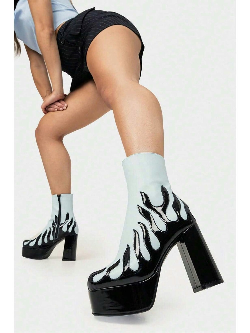 High Voltage Platform Ankle Boots in Blue. These Platform Boots feature a patent black flame sole and heel, charging up your shoe game. these Boots are shockingly stylish!