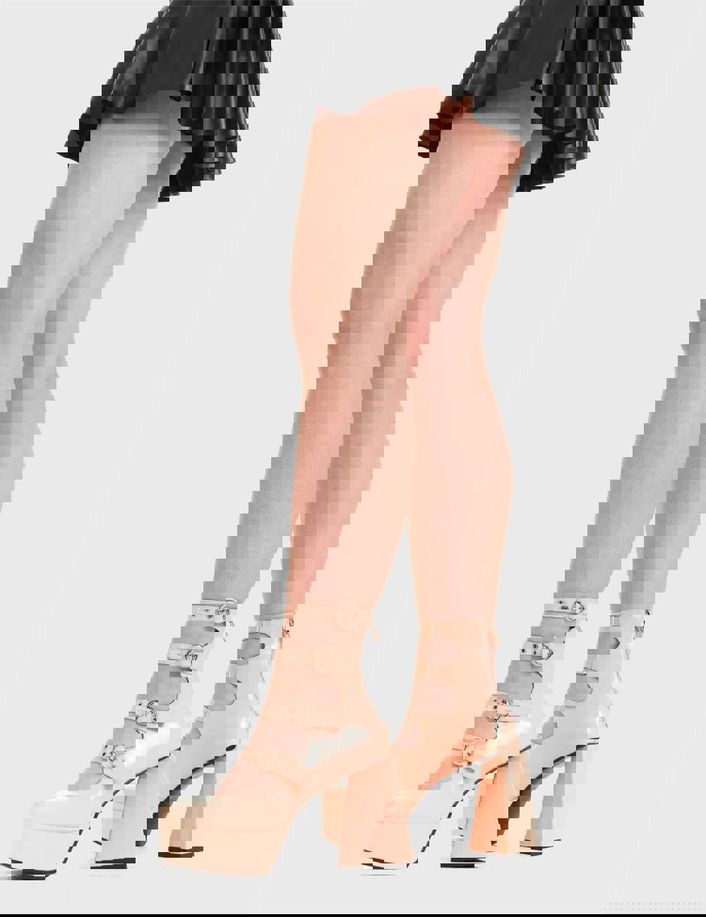 True Romance Platform Heels in Pink patent. These platform boots feature four silver buckles with adjustable straps, keeping it nice and classy. , these platform boots are edgy.
