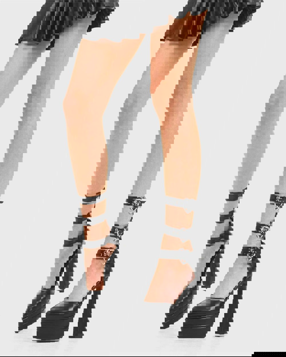 Complex Love Platform in Black faux leather. These platform heels feature three adjustable straps with heart shaped silver buckles and eyelets. , these platform boots are chic.